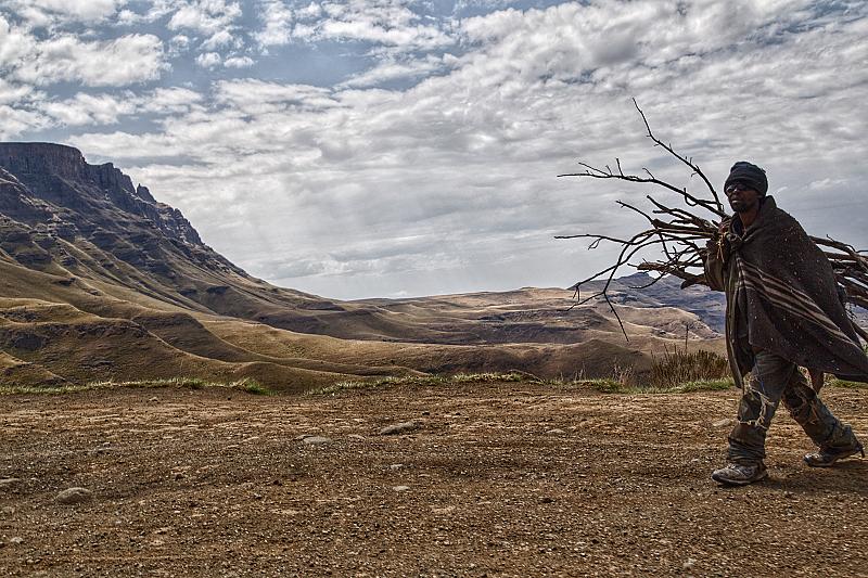 Op de terug weg vanaf de sani pass in Zuid afrika kwamen we deze man tegen. Hout vanaf beneden gehaald, boven hebben ze geen bomen.