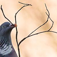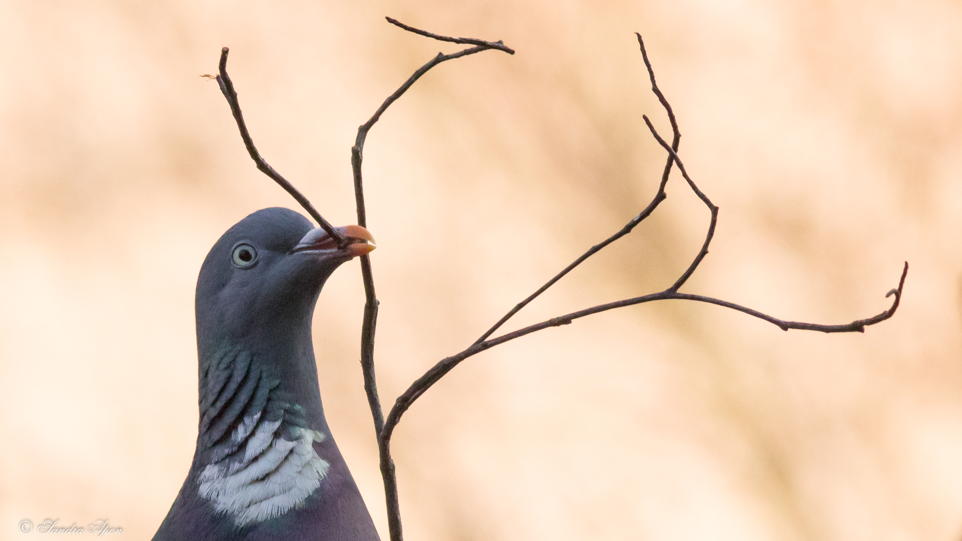 Deze houtduif versleept hele takken om zijn nest voor elkaar te krijgen. Heeft hij de lente in zijn bol?