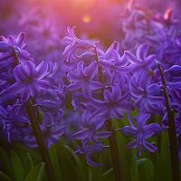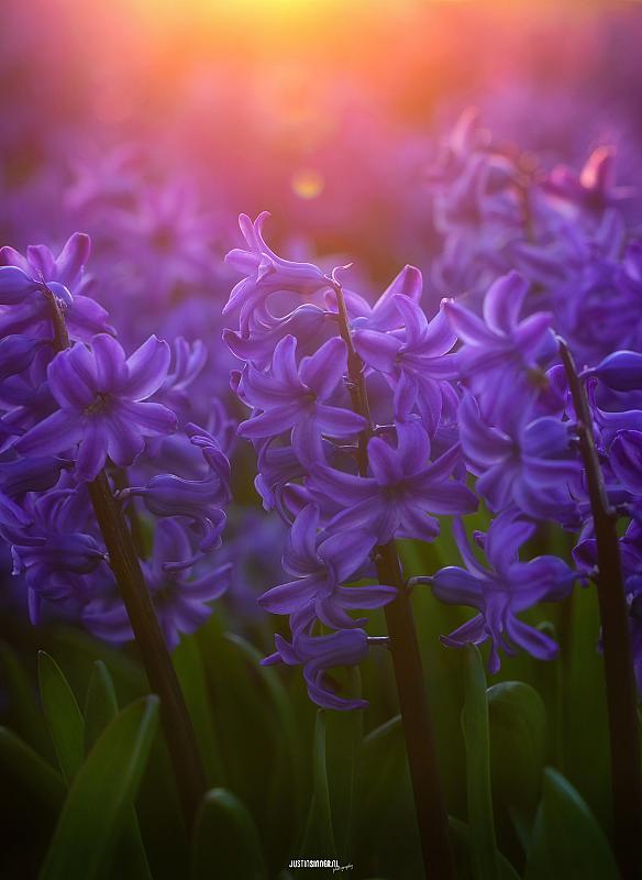 De geur is bedwelmend, bijna sprookjesachtig. Tussen de lange rijen bloeiende hyacinten ligt een stilte die alleen wordt doorbroken door het zachte gezoem van bijen die hun laatste ronde maken. De zon glijdt achter de horizon, terwijl haar stralen over de bloemen dansen en een gouden gloed werpen over het landschap.