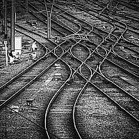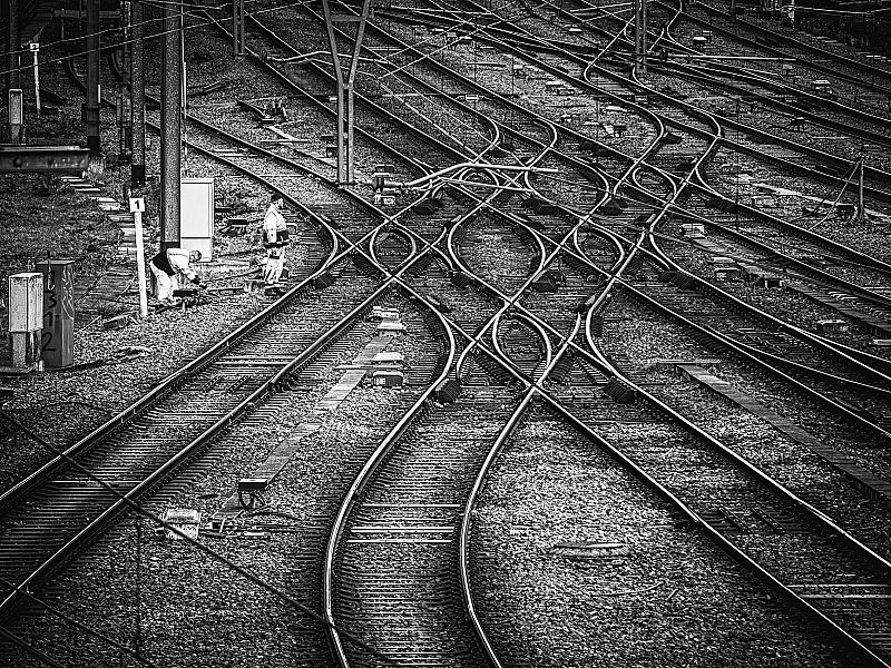 Werk aan het spoor bij Luik. Ik was getroffen door het ingewikkelde lijnenspel, en toen ik de werklui zag staan was het plaatje voor mij compleet.