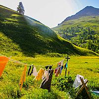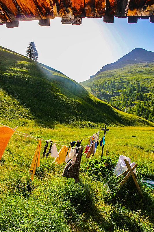 Opgehangen was in de zomerzon op een ochtend in de Alpen.