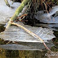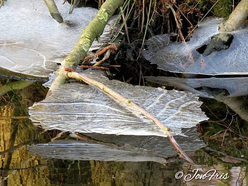 Bevroren water dat iets gezakt is waardoor deze ijs bladeren zijn ontstaan..