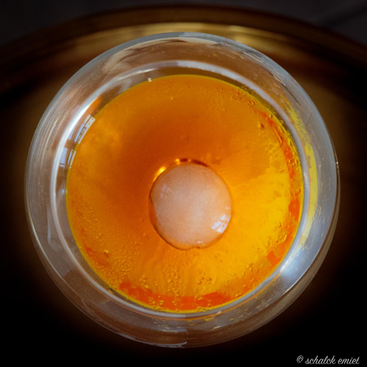 de foto toont een ijsbal die in een bolglas met een drankje drijft