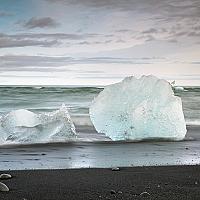 Op strand op IJsland komen sommige ijsblokken terecht, met een lange sluitertijd komt de zee in beweging om het ijs heen.