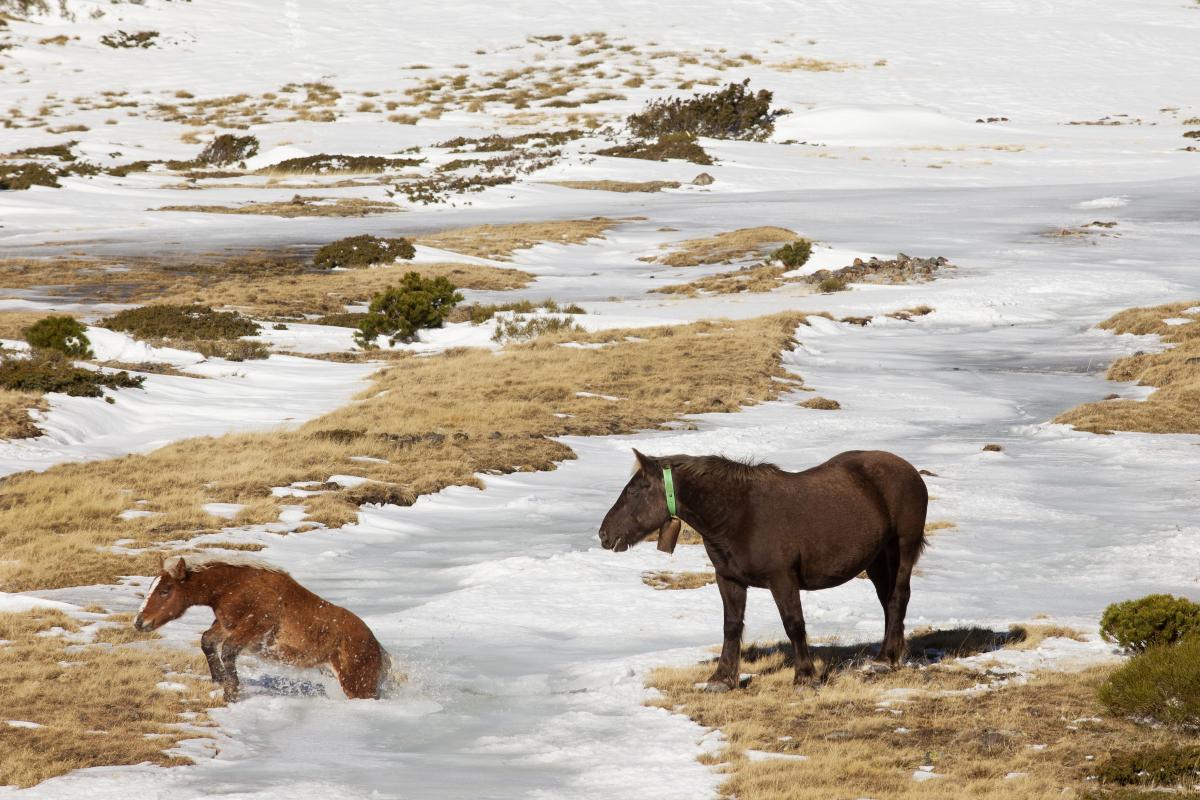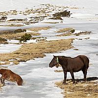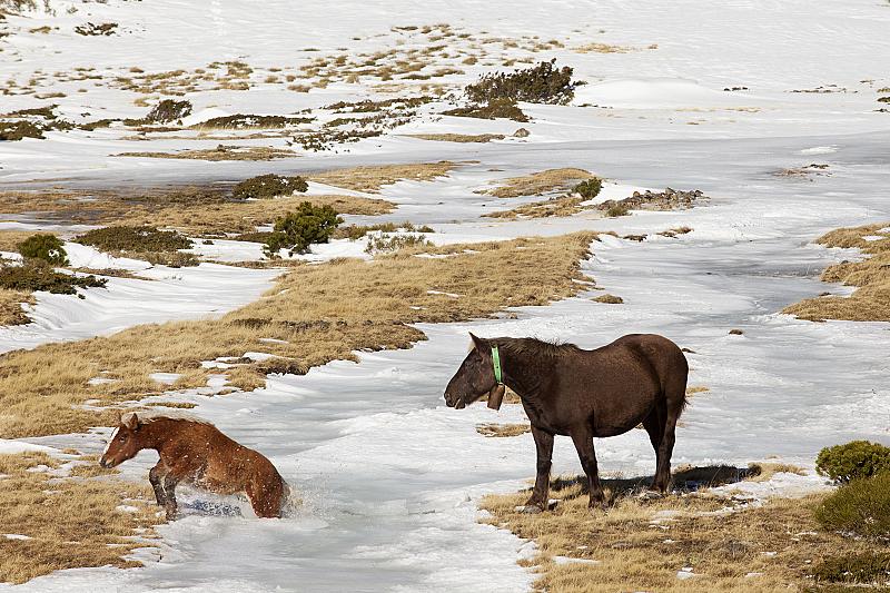 In de Franse Pyreneeén lopen op sommige plekken paarden vrij rond,wij waren daar eind oktober en het had al flink gesneeuwd en ook wat gevroren, dit veulen wilde over een beekje lopen maar dat ging niet zo goed, moeders kijkt toe hoe ze door het ijs heen zakt.