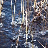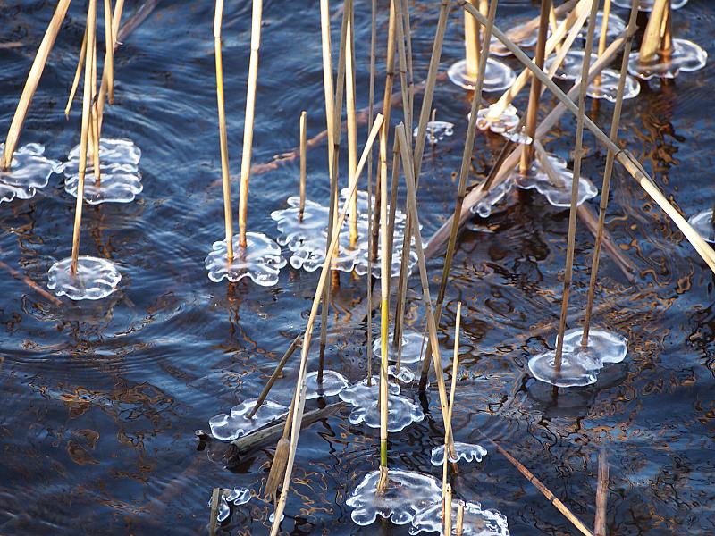 Het vroor erg hard maar door de wind wilde er maar geen ijs groeien op deze plas, alleen wat ijskraagjes om de rietstengels.