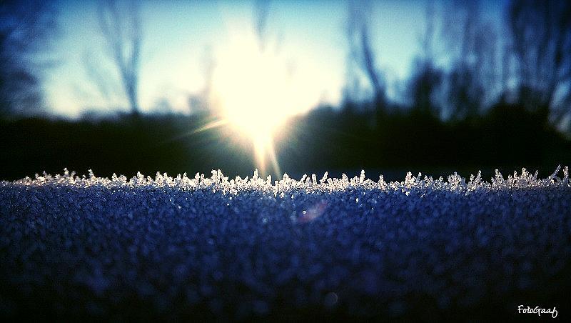 Het was een koude nacht getuige deze brugleuning aangezet met rijp, prachtig hoe die heuse ijskristallen oplichten in de opgaande zon.