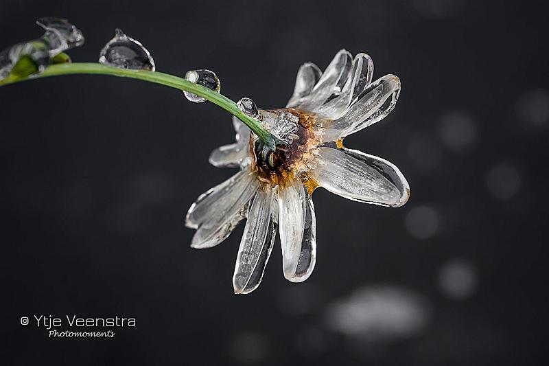 Dankzij de ijzel in het noorden van Nederland heb ik deze foto kunnen maken. De margriet stond nog altijd in bloei dankzij de zachte winter, totdat de ijzel kwam.