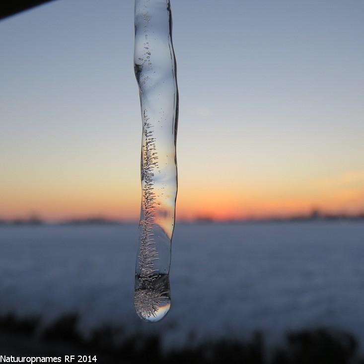 IJspegel, hangend aan een tak van een Kronkelwilg met op de achtergrond het besneeuwde polderlandschap bij een net ondergegaan zijnde zon.