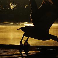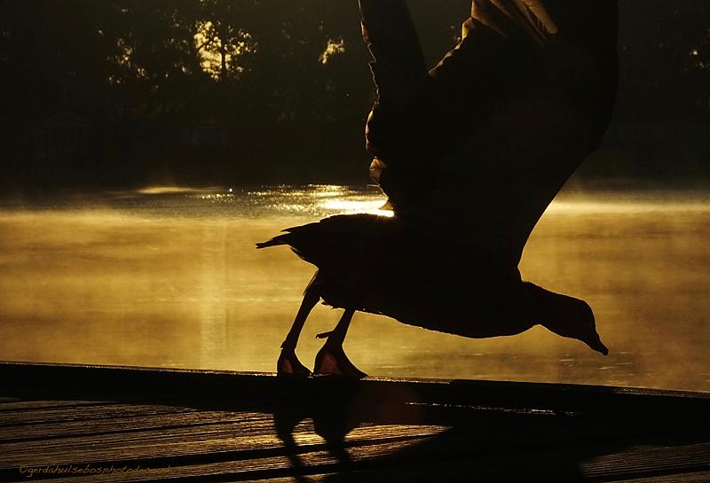 Nijlgans in tegenlicht op een steiger aan het meer. Doordat ik op het grasveldje naast de steiger kon staan kon ik dit moment afwachten en net op tijd afdrukken