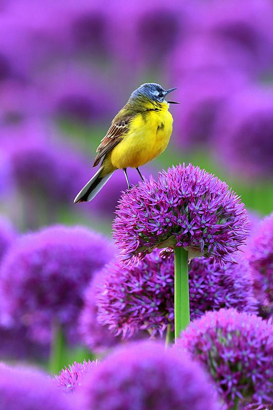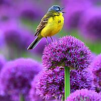 Gele kwikstaart op een Allium Ambassador bij Alkmaar.