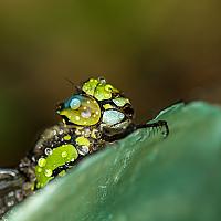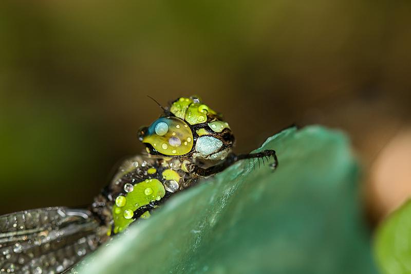 Druppels op het oog van de Libel, die dus maar moet wachten tot de zon weer gaat schijnen of de wind gaat waaien.