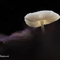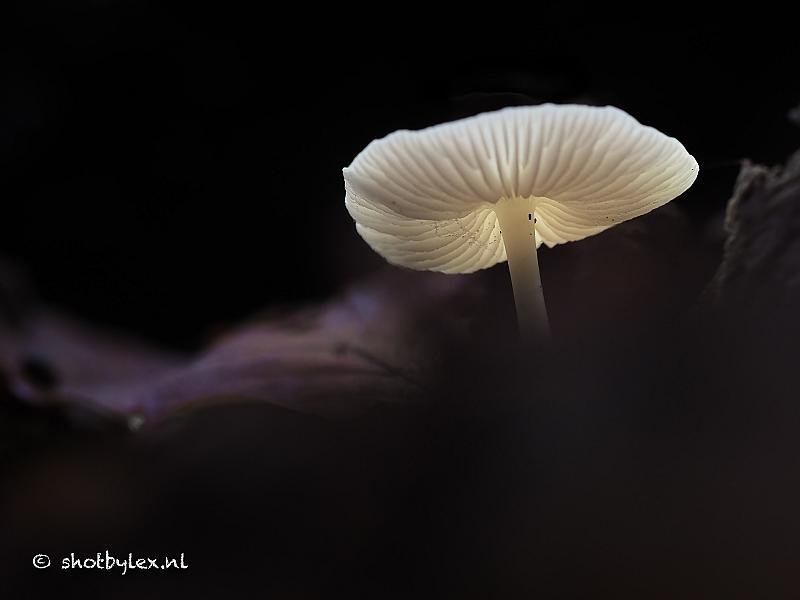 Zelfs in een donker bos is genoeg te zien. Klein paddenstoeltje uitgelicht met een kleine zaklamp.