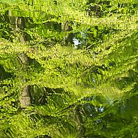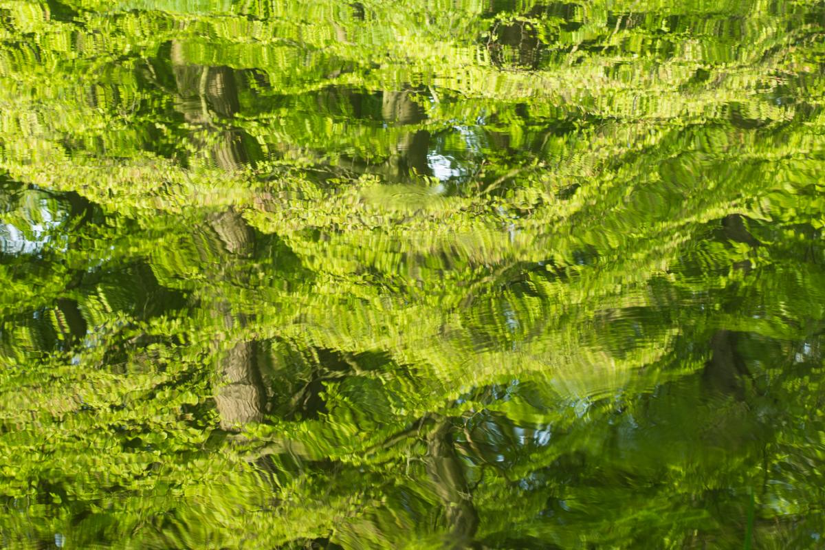 Weerspiegeling van bomen in kabbelend water