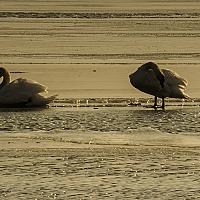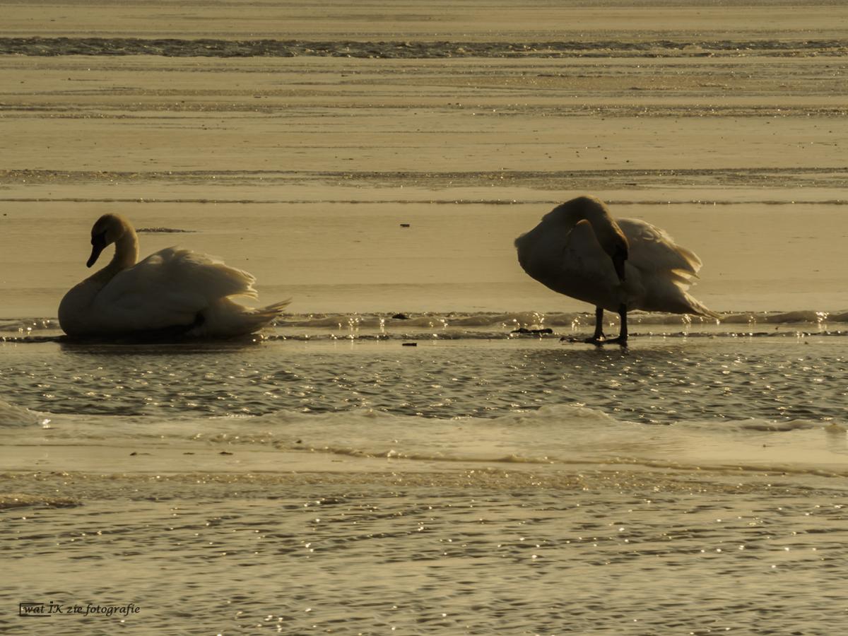 Superkoud was het toen aan het waddengebied. Twee zwanen die met het licht van de ondergaande zon in een wak zwommen/liepen.