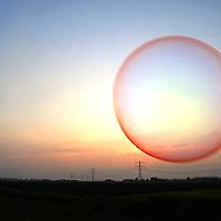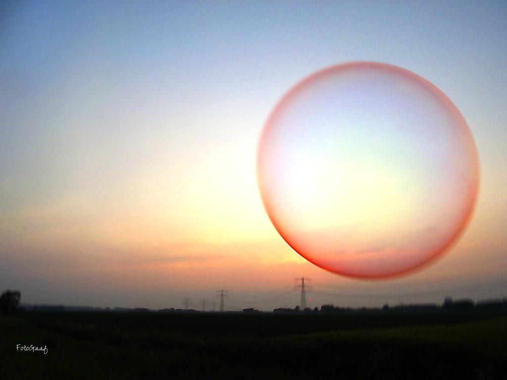 Na een aantal grijze dagen was er weer eens een prachtige rode zonsondergang ondanks de nevel in de lucht. Deze zeepbel absorbeert het warme rode licht van de ondergaande zon, die je als een rood balletje kunt zien naast de electriciteitsmast (even op de foto klikken, dan zie je het)