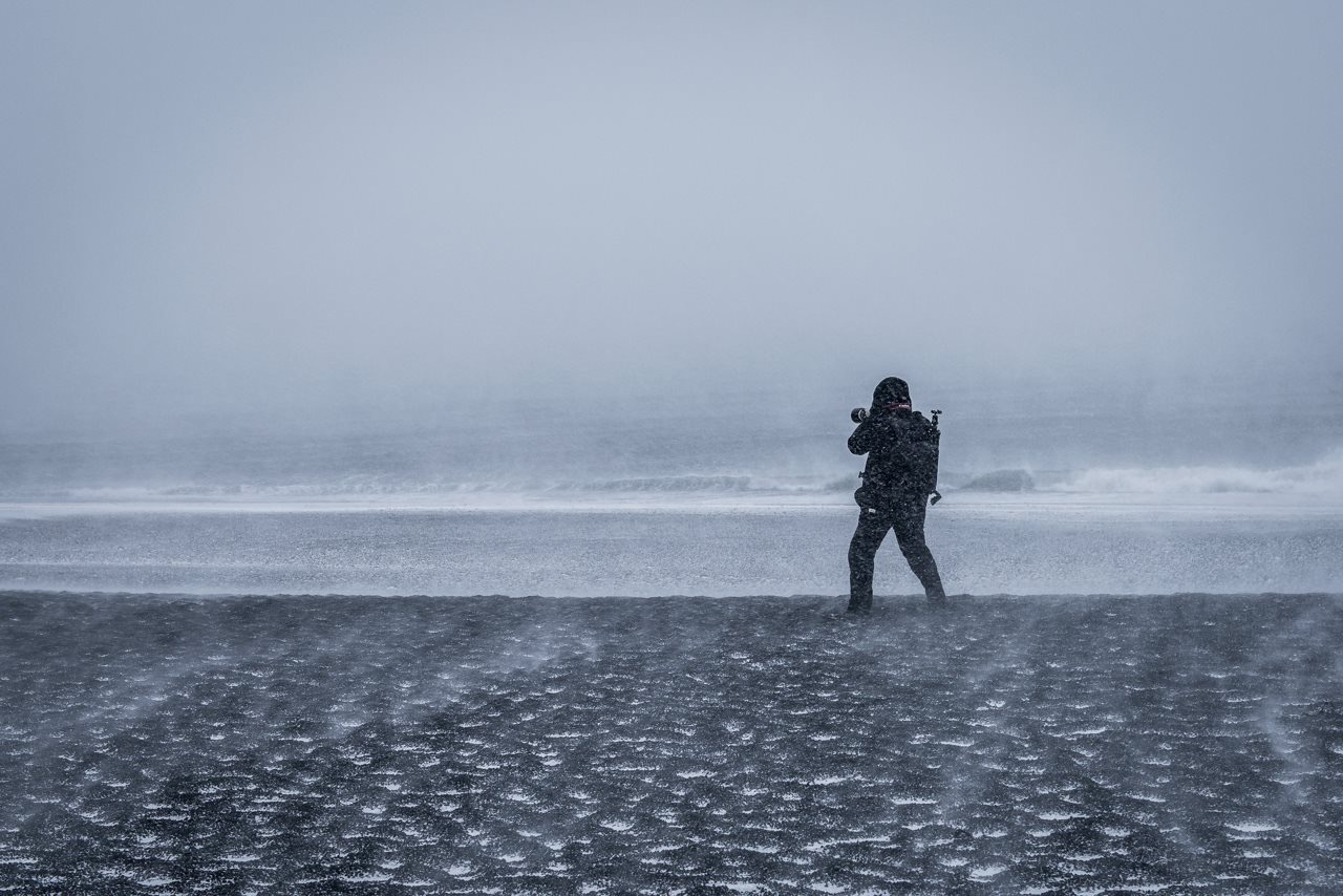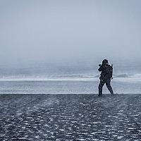 Op IJsland moet je de elementen van de natuur trotseren. Hier windkracht 12 en heel veel sneeuw. Deze foto is in kleur, maar lijkt door het weer en het zwarte strand meer op een zwart-wit foto.