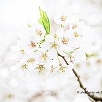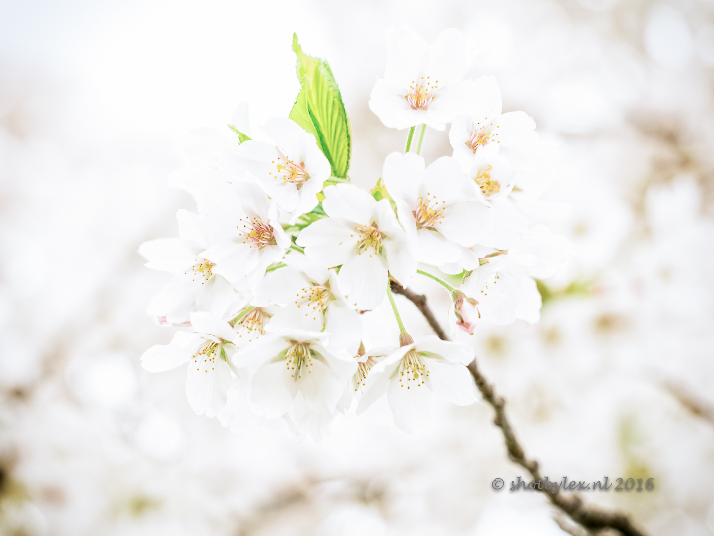 Bloeiende bloesem en jong groen blad. Het begin van de lente.