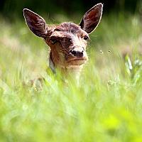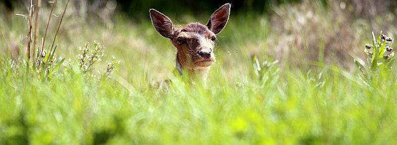 Jong damhertje dat geniet van de eerste zonnestralen en het verse groene gras!