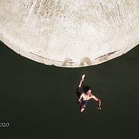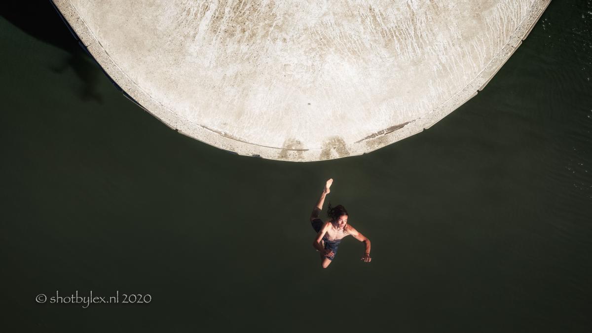 Op zoek naar verkoeling springt deze jongen in de Spiegelwaal bij Nijmegen. En dat springen moet natuurlijk wel op coole wijze!