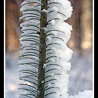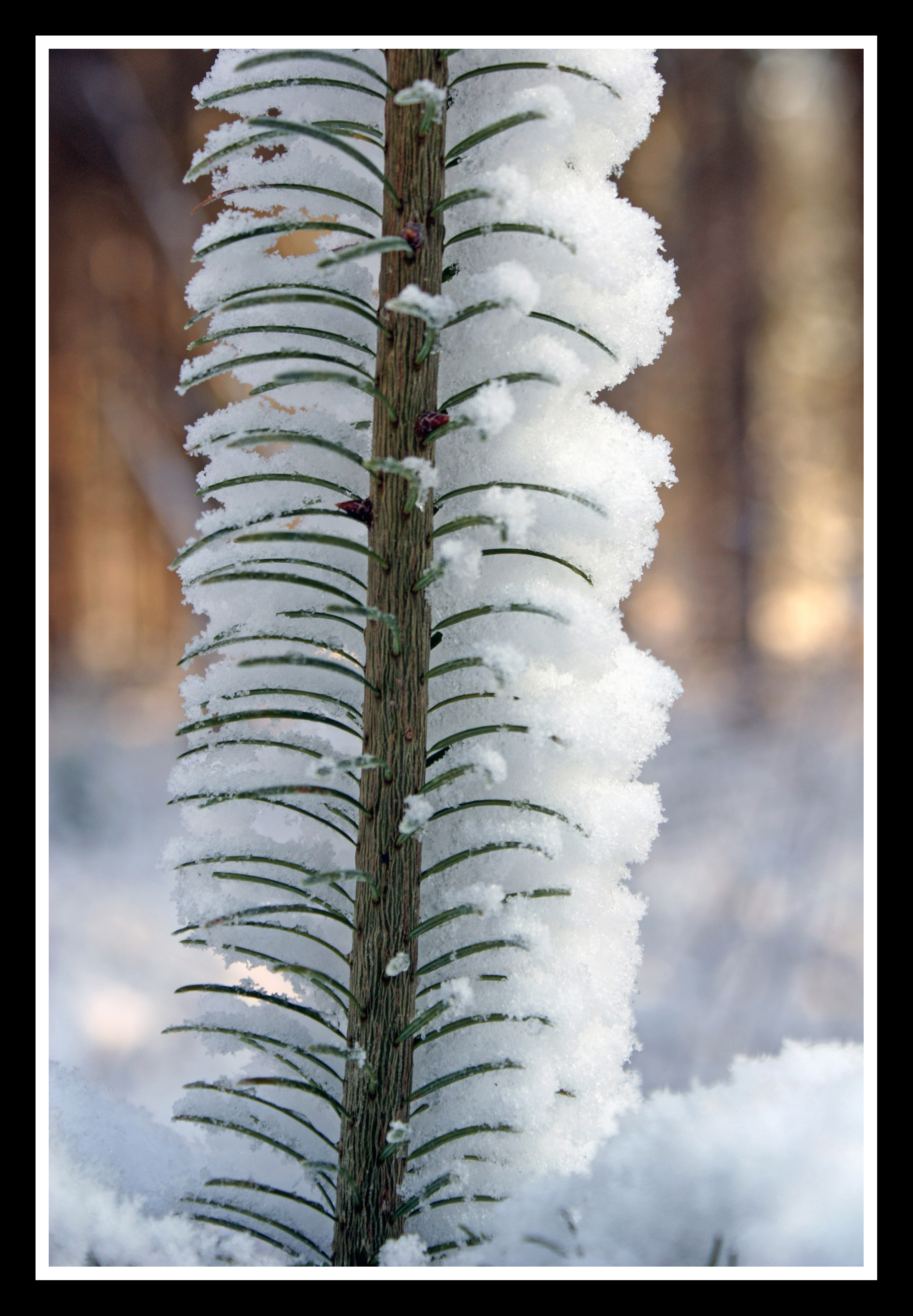 Een tak van een spar, maar dan heel dichtbij en overladen met sneeuw!