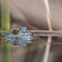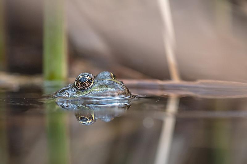 Camera vlak boven het water gehouden om de kikker en zijn fraaie reflectie te kunnen vastleggen