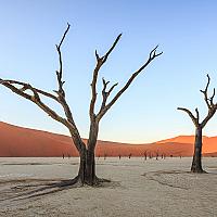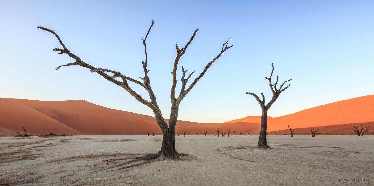 Ooit was er op deze plek een rivier die er voor zorgde dat er acacia's konden groeien. Door een verandering in het klimaat werd het gebied geteisterd door droogte, zandduinen omringden de vlakte waardoor de waterstroom van de rivier geblokkeerd werd. Omdat er te weinig water bij de bomen kwam zijn ze gestorven en zwartgeblakerd door de zon. Locatie: Dead Vlei, Namibië.