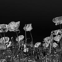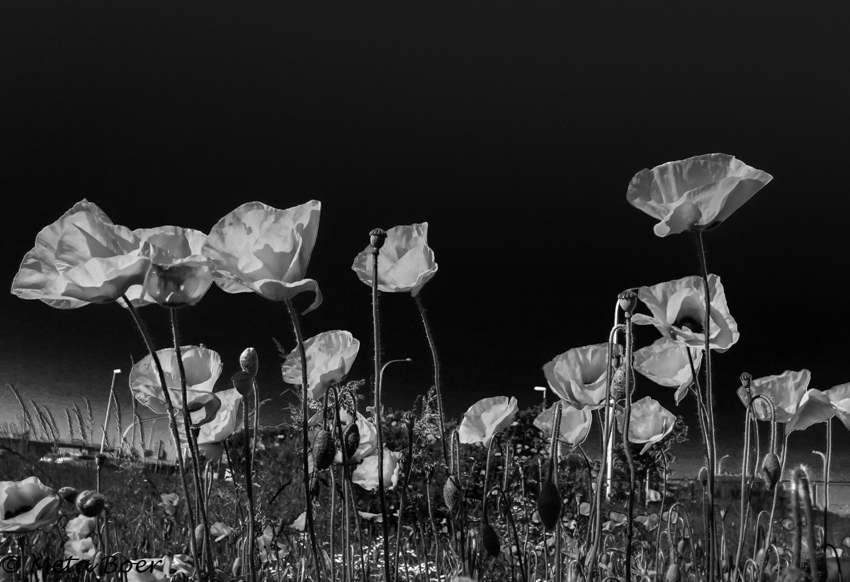 Na omzetten in z/w, blauwe van de lucht ver naar de min trekken, rood van de bloemen ver naar plus trekken, groen lichtjes naar min.