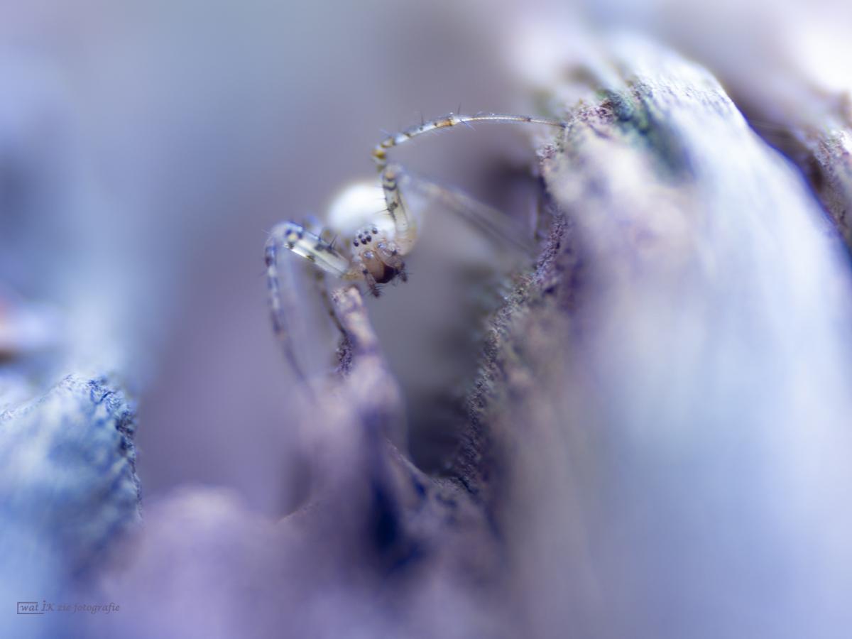 Een klein spinnetje in het bos.....hij/zij bleef mooi zitten zodat ik de kans had om een foto van hem/haar te maken. In dit geval heb ik voordat ik de foto ging maken besloten om de witbalans op koel te zetten, daardoor kreeg ik mooie blauwroze tinten in de foto.