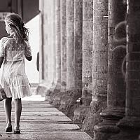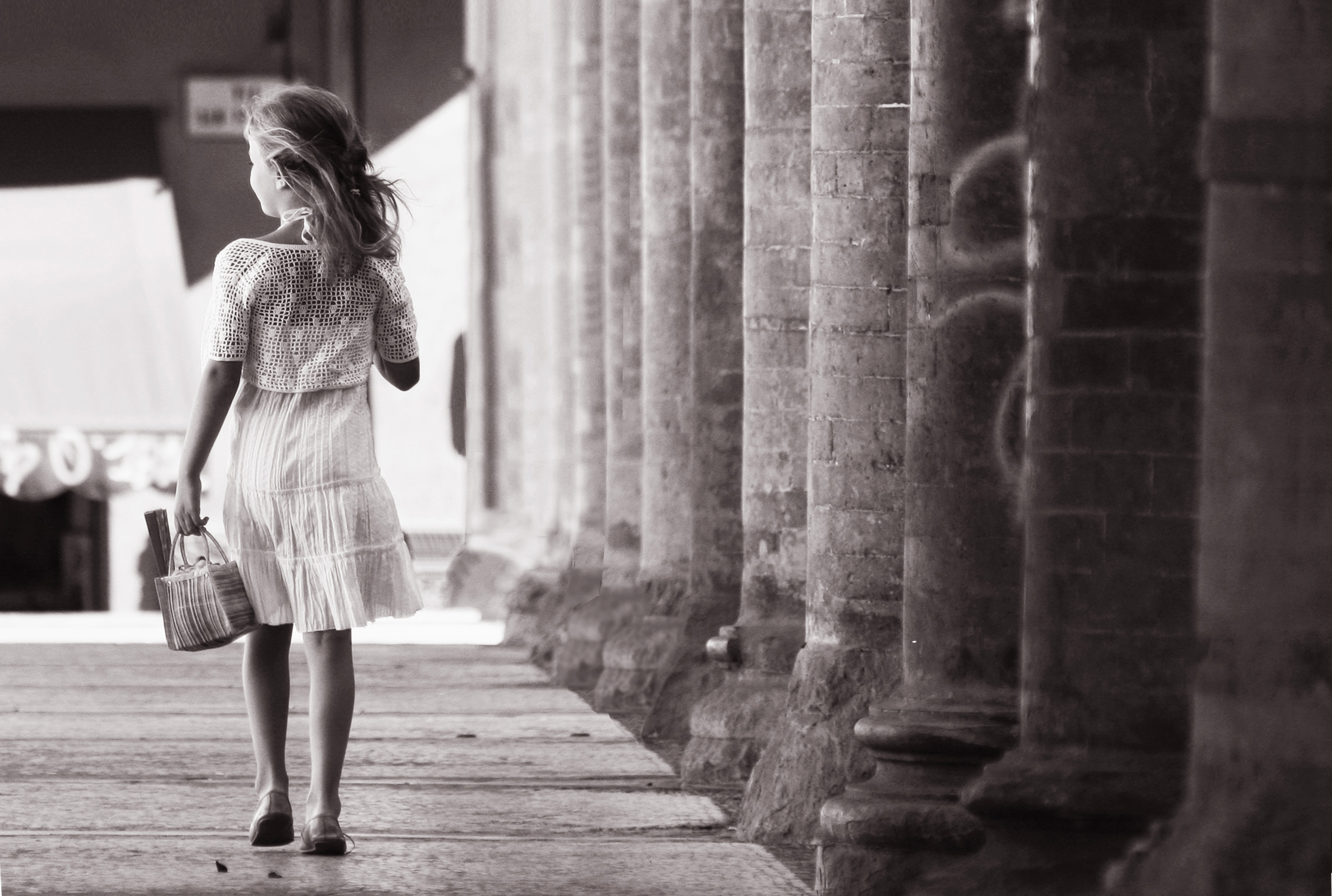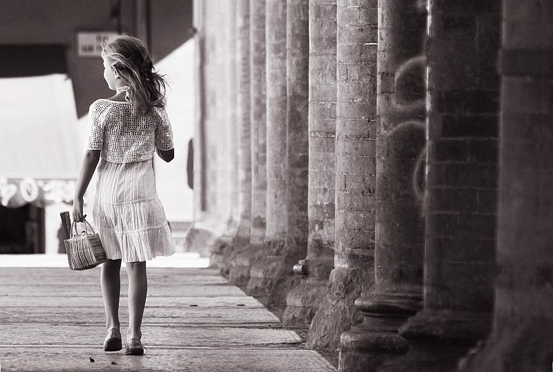 De foto is genomen in Bologna, mijn dochter liep, ladylike als ze van zichzelf is, langs deze oude zuilengalerij van een heel oud gebouw, en het plaatje was geboren.