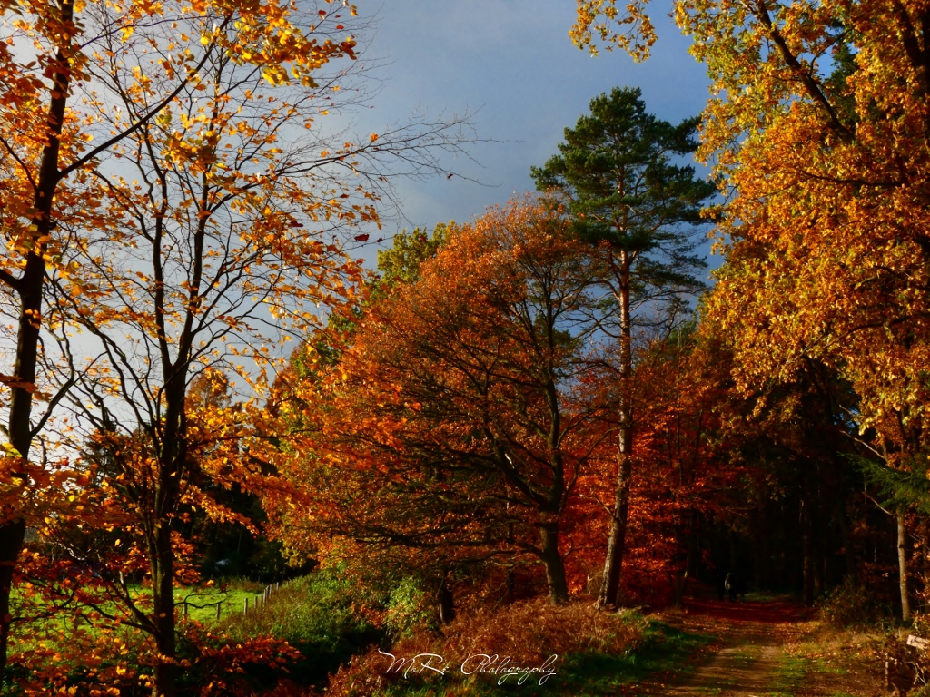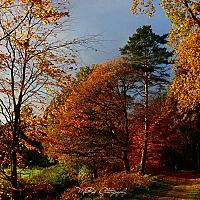 Het zonlicht laat de herfstkleuren mooi uitkomen tegen de donkere lucht (opkomende bui) in de achtergrond.