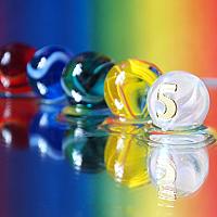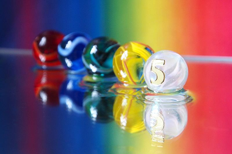 Vijf knikkers in vijf verschillende kleuren. Op spiegel gefotografeerd met gekleurd papier als achtergrond.