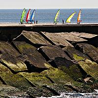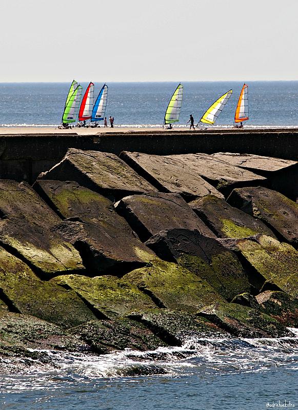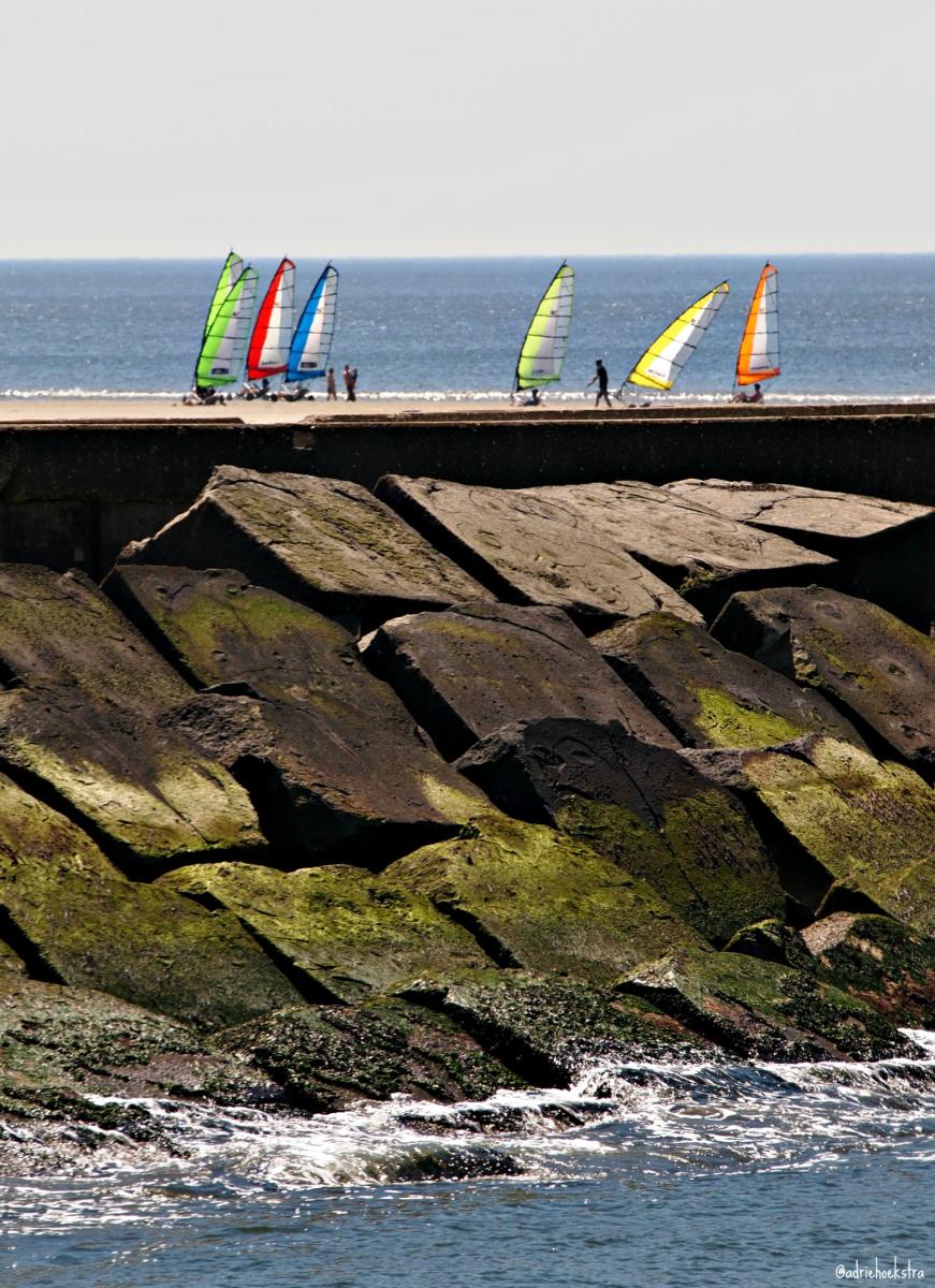 vrolijke gekleurde zeiltjes op het strand bij de pier