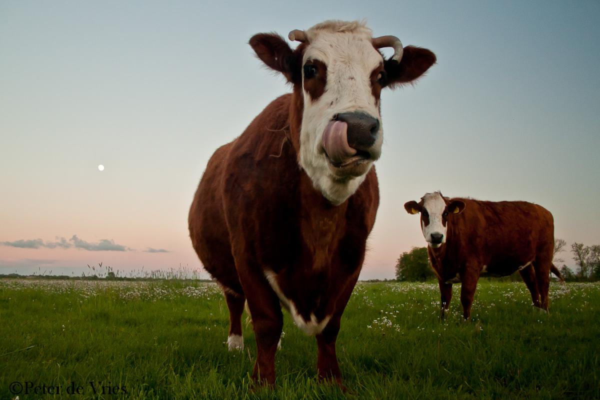 Ook de simpele dieren kunnen enorm leuk zijn voor een foto, dat bewezen deze koeien, na terug komst van een rondje foto's maken kwamen we dezen tegen de avond nog tegen, tijdens het vastleggen was het nog net licht genoeg en dat maakte ook wel weer een leuke sfeer aan de foto! De maan is zelf nog links in de hoek te zien, Prachtige beesten!