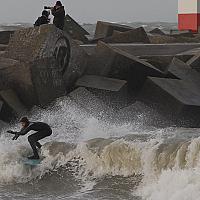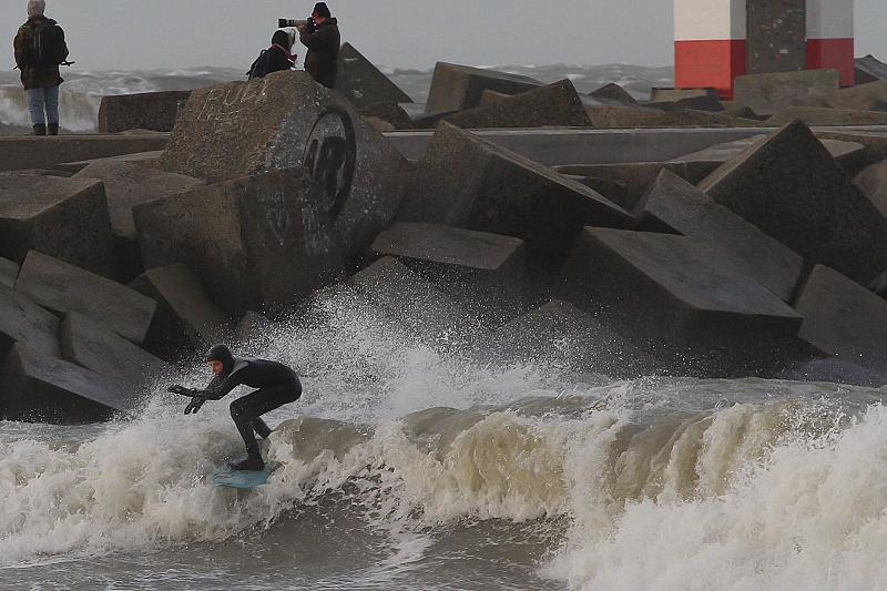 Decemberstorm in Scheveningen, golfsurfer vlakbij de havenhoofden.