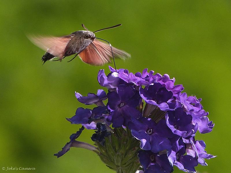 Een paar keer per jaar zie ik de Kolibrievlinder in mijn tuin. Het is me nog nooit gelukt om een goede foto te maken. Tot gister.