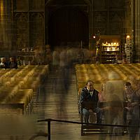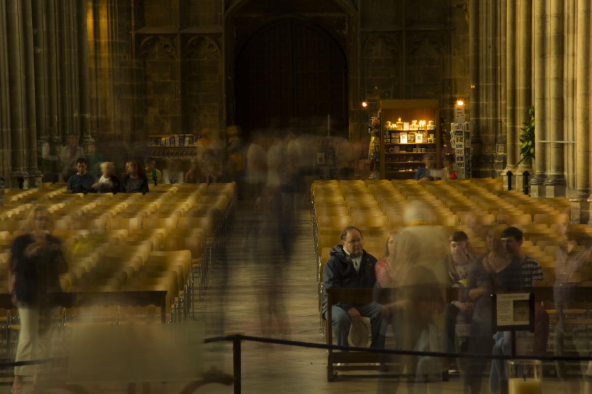 Een beeld dat bedoeld is als visualisatie van het feit dat de meeste toeristen vluchtig even binnen kijken, maar dat de kathedraal van Canterbury (waar deze foto gemaakt is) er al die jaren al onveranderd staat.