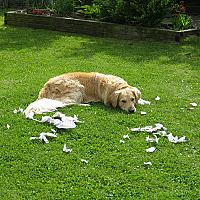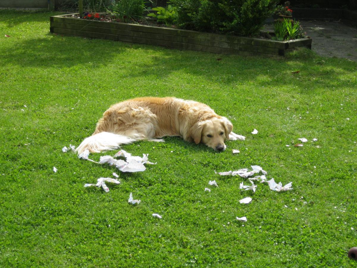 Mazzel heel onschuldig tussen de overblijfselen van een krant... Je ziet 'm denken: IK ben onschuldig!!