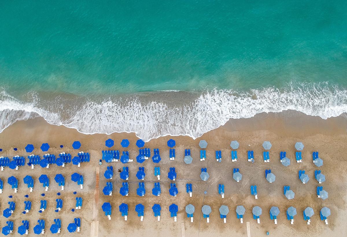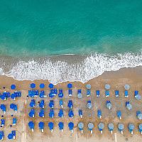 Een mooie avondfoto waar de standbedjes net leeg zijn en de drone op verkenning over het strand vliegt.