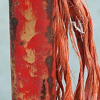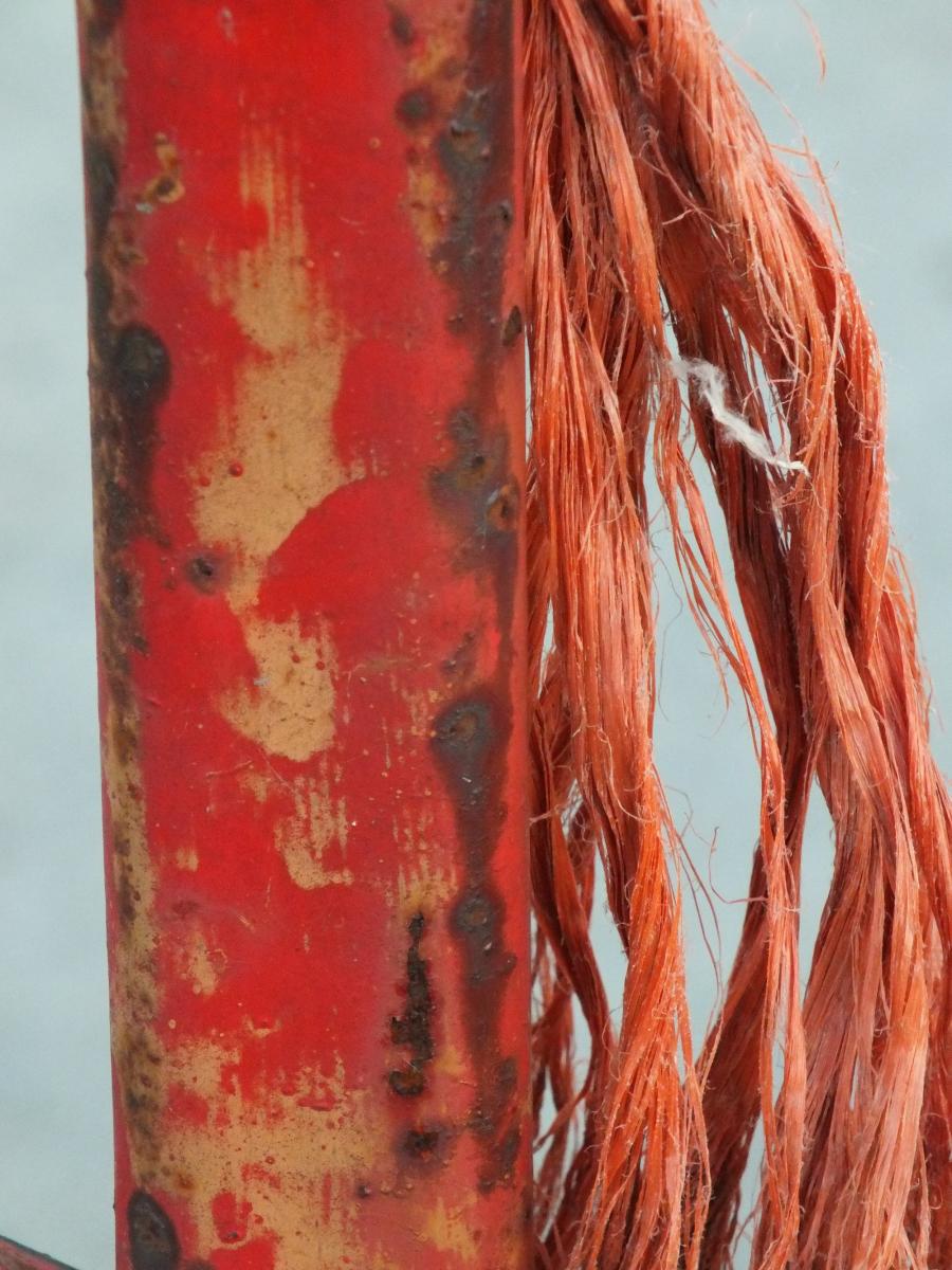 Langs de kant van het weiland stond dit hek met het oranje touw om het dicht te houden. Van dichtbij vormde dit een prachtig beeld in vele tinten oranje.