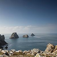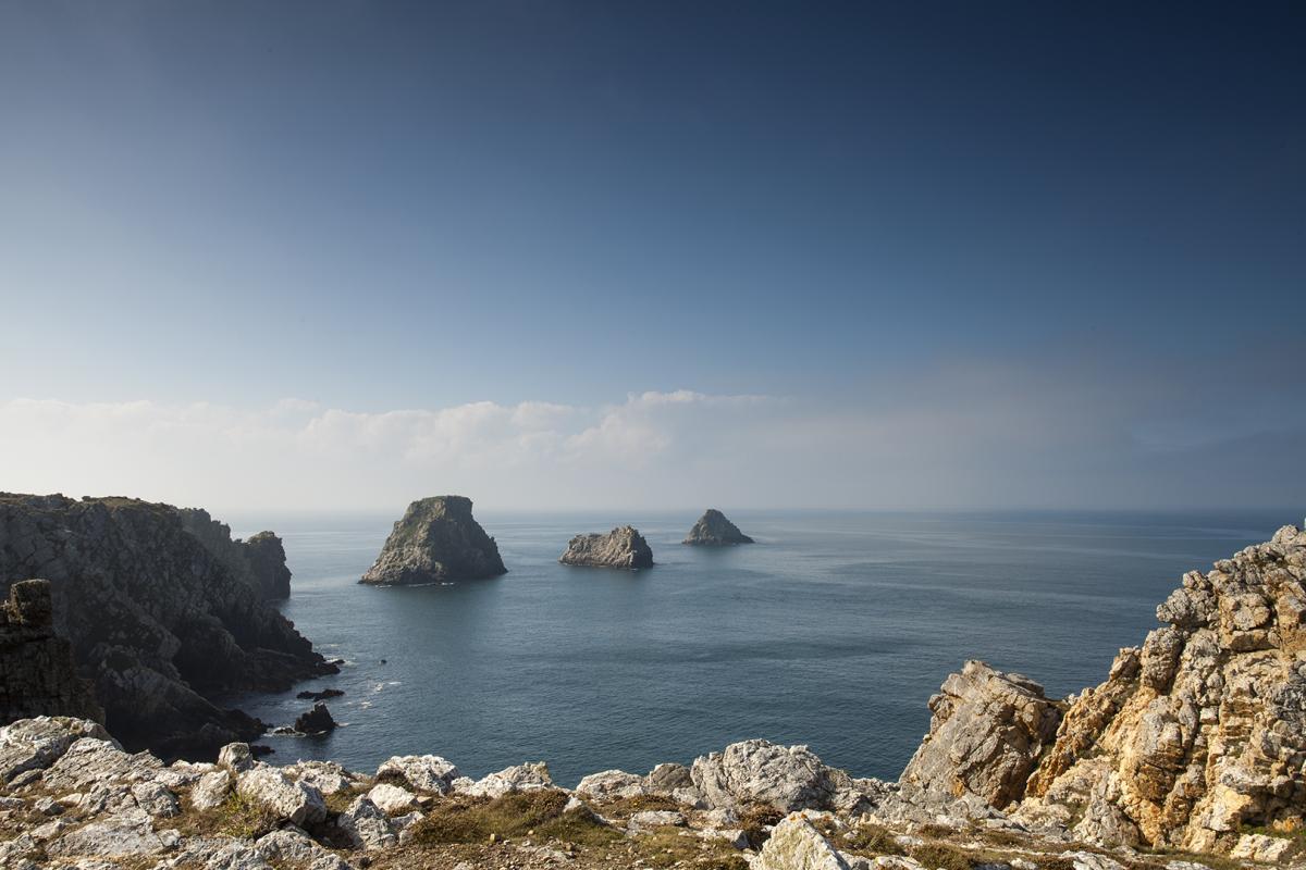 De kust in Bretagne, zo mooi, lekker ruig, mooi blauw water, en veel rotsen in het water.