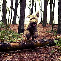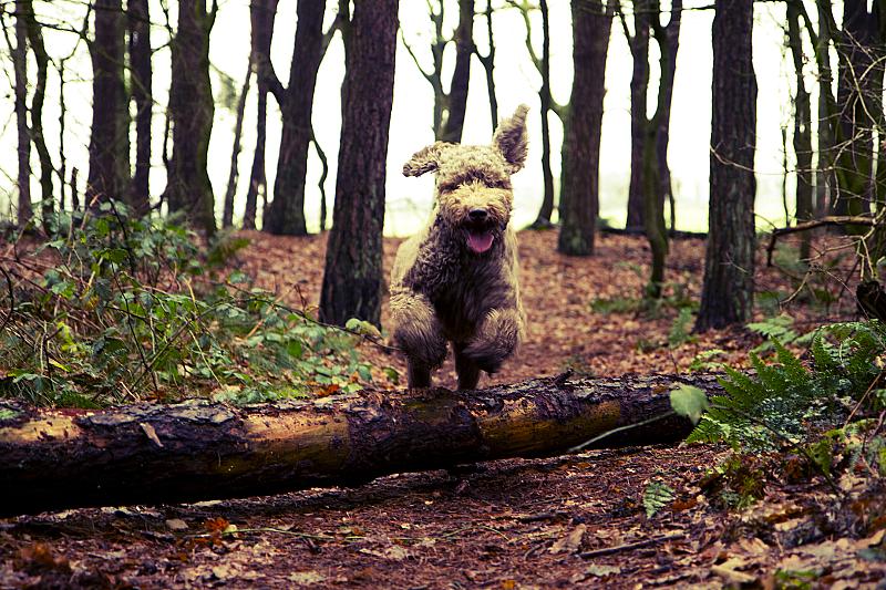 Tommie is een labradoodle en dol op springen, hij kan heel hoog en heel hard. Ik ben daarom achter deze boomstam gaan zitten om hem in aktie te kunnen fotograferen en dat lukte zomaar....