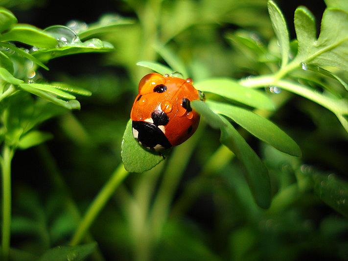 Een klein lieveheersbeestje verstopt tussen de bladen voor de regen.