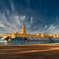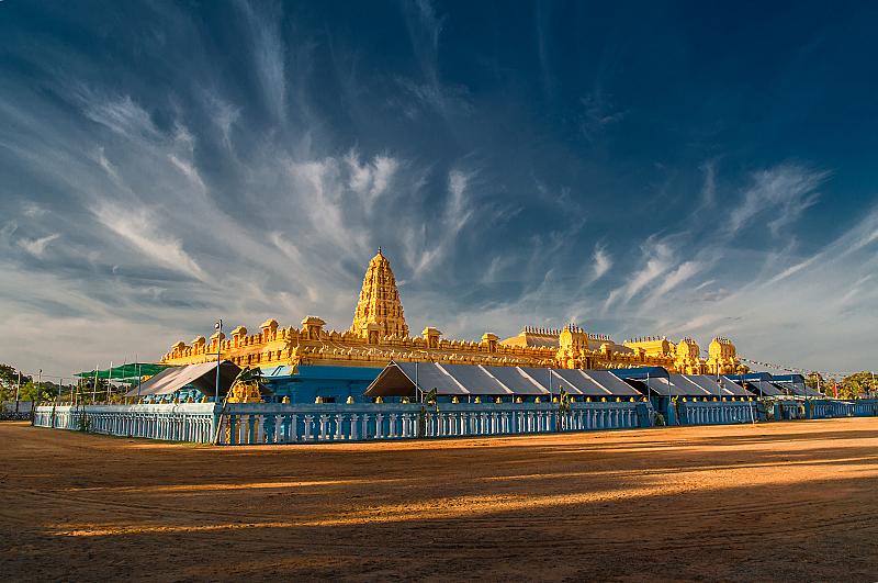 In grote getale komen de hindoes van de omgeving hier naar toe om hun geloof te belijden, bij mijn aankomst was de zon op zijn laagste punt en de wolken boven het gebouw gaven kracht aan de spiritualiteit die het gebouw uitstraalt met het hemelse blauw en goud terwijl door de speakers het geluid van de hindoe spreker het terrein vulde.