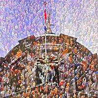 Op de foto is de toren van het Paleis op de Dam te zien en door de foto heen duizenden mensen...