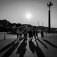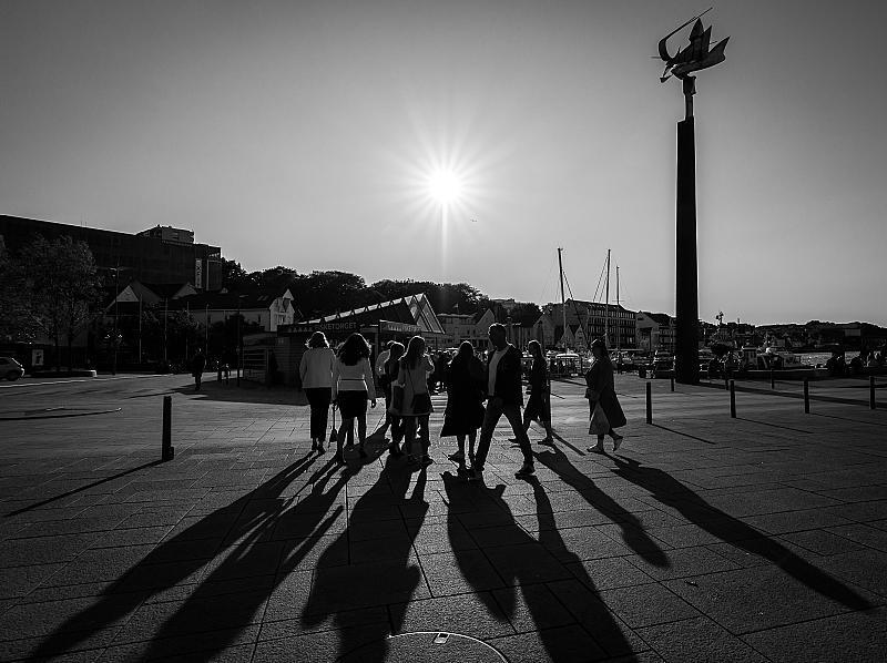 Tijdens een wandeltocht in Stavanger, Noorwegen, de schaduwen maken reuzen van de mensen