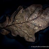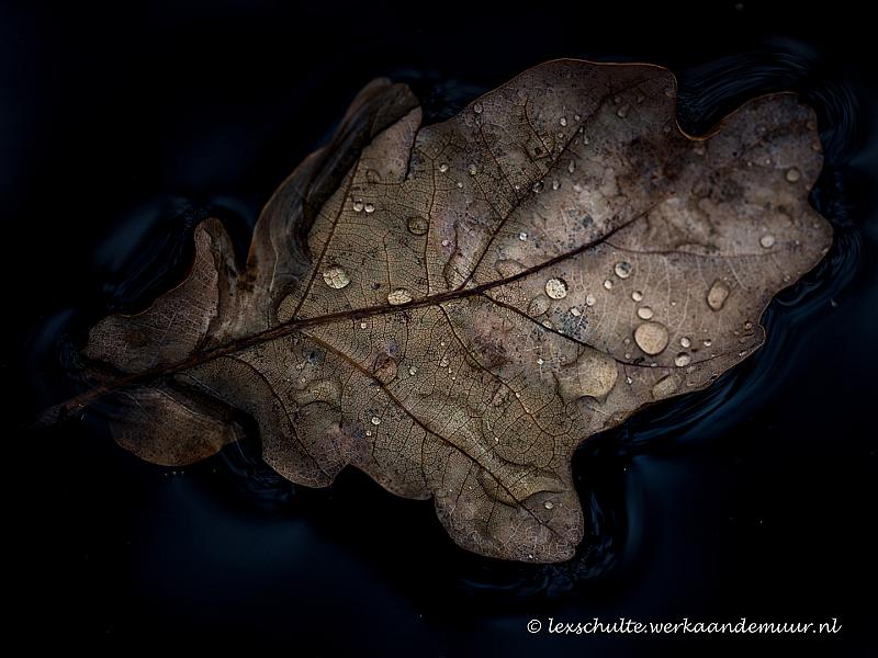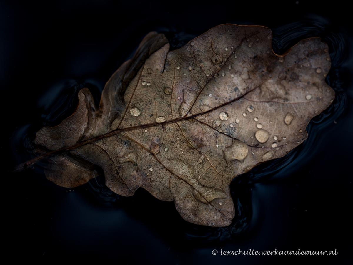 Tot aan mijn enkels, stond ik in de modder om dit blaadje drijven in een poel in het bos te kunnen fotograferen. Camera op statief erboven gezet en zo een macro opname gemaakt. De sfeer van de herfst...