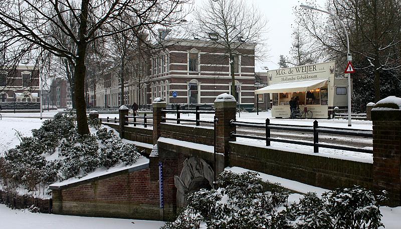 De gebakkraam voor oliebollen heeft zijn doek omhoog .