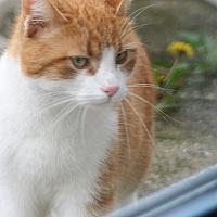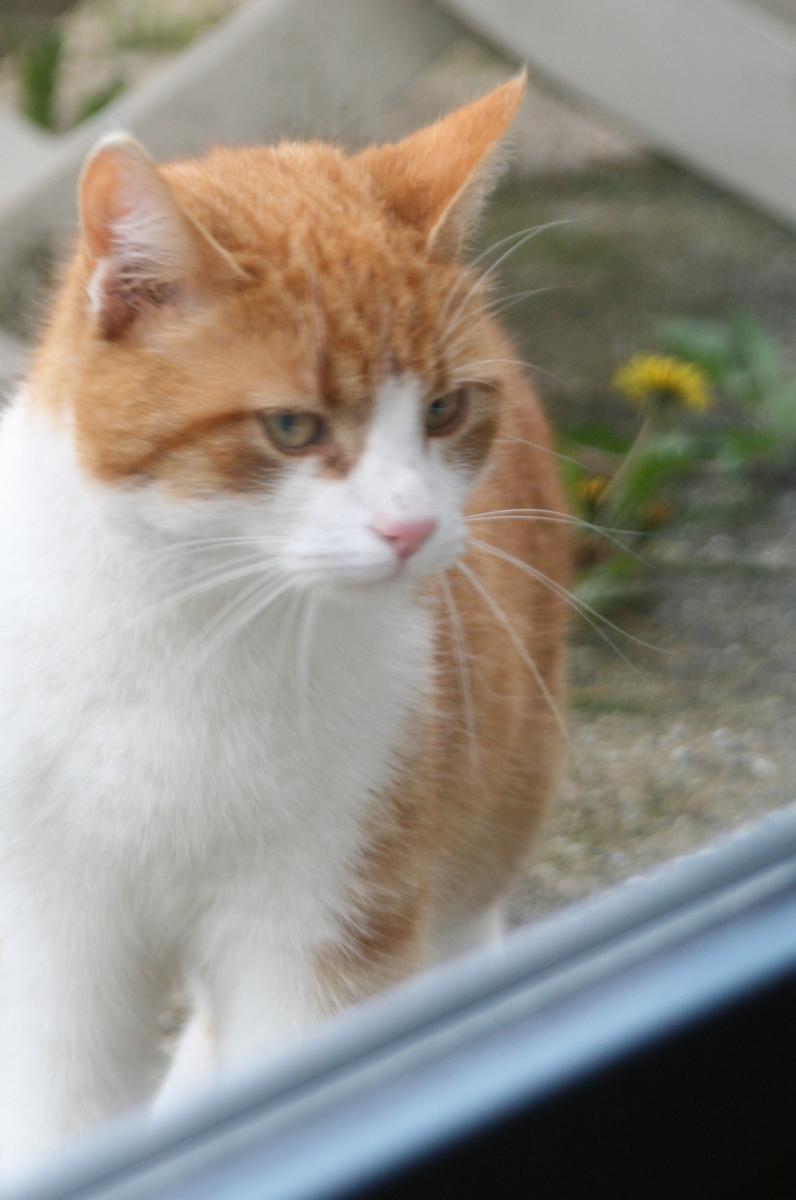 Deze buurtpoes kijkt door onze tuindeur naar binnen... Maar binnen ligt onze hond!!! (Hond is waarschijnlijk banger dan poes maar dát weet de poes niet.)