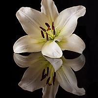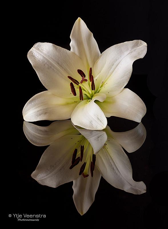 Deze foto is gemaakt met behulp van zwart plexiglas. Hierop heb ik de lelie neergelegd en gezocht naar de juiste positie voor een symmetrisch beeld en mooie heldere spiegeling.